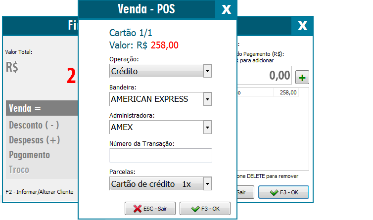 Ao pressionar OK (F3) para finalizar a venda será exibida a tela para finalizar a transação no Cartão. Informe os dados desejados e clique em OK (F3)