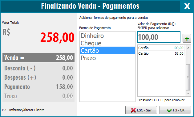 Após finalizar o lançamento dos itens basta pressionar a tecla F3, dessa forma podemos escolher a forma de pagamento.
