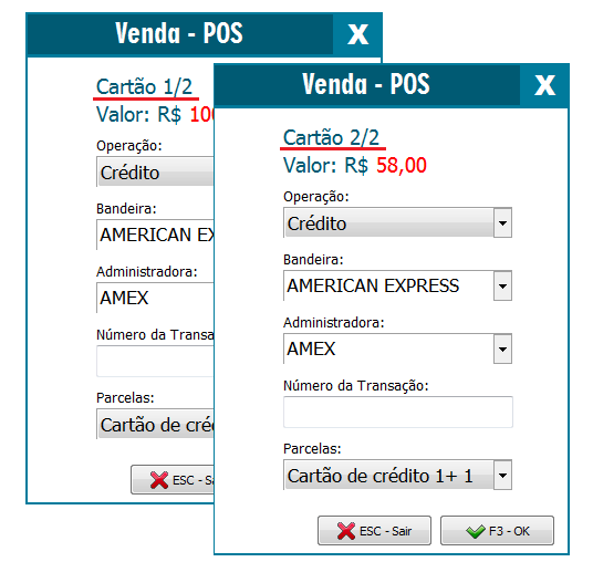 No exemplo acima parcelamos em dois Cartões e o restante no Dinheiro. Poderá selecionar o tipo de operação para cada Cartão (será apresentada uma tela para cada operação no cartão) e finalmente finalizar a venda. Poderá parcelar em quantos cartões precisar, quanto ao sistema não existe um limite.
