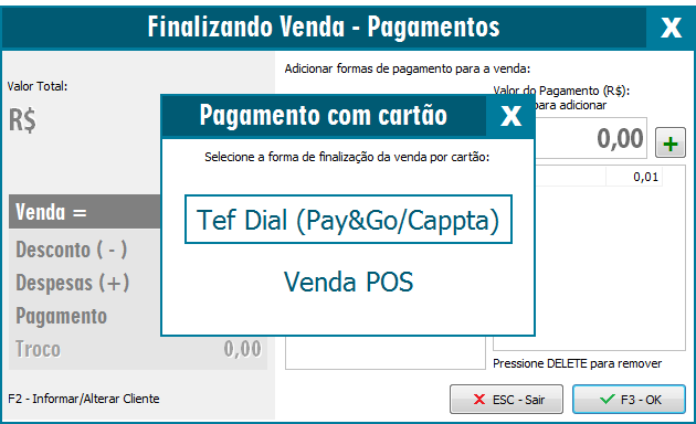 É necessário possuir uma solução TEF devidamente instalada no computador, para mais informações consulte o técnico do TEF.
