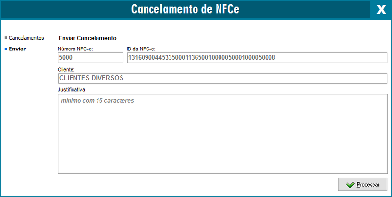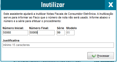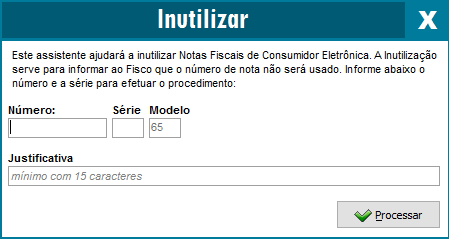 Somente será possível inutilizar uma NFC-e ainda não autorizada. Ao selecionar a opção será apresentada uma tela onde deverá ser informado o número, a série e a justificativa da inutilização com no mínimo 15 caracteres. Em seguida, clique em Processar.