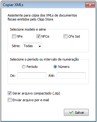 Ao clicar neste ícone será apresentada a tela de Copiar XML's. Informe o modelo e série de suas notas em seguida selecione o período ou número das vendas que deseja salvar os arquivos XML's e Clique em Salvar, será aberta uma janela para definir a pasta que deseja salvar os arquivos XML's copiados em seu computador, selecione a pasta desejada. Por fim, clique em Salvar.