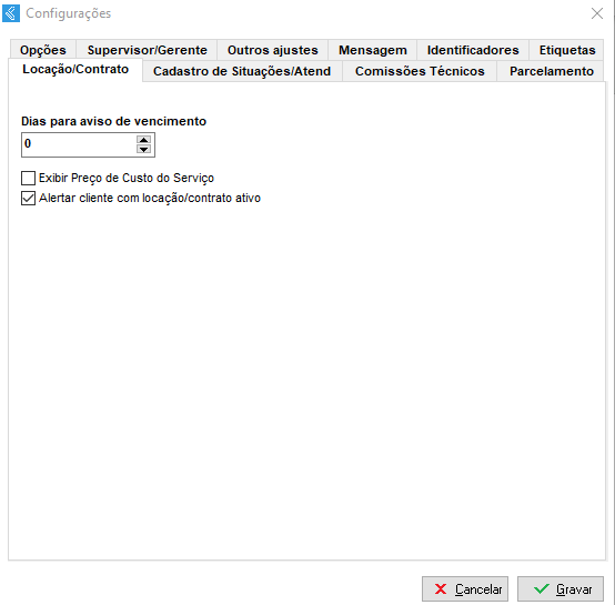 Na Aba Locação/Contrato temos as seguintes opções: