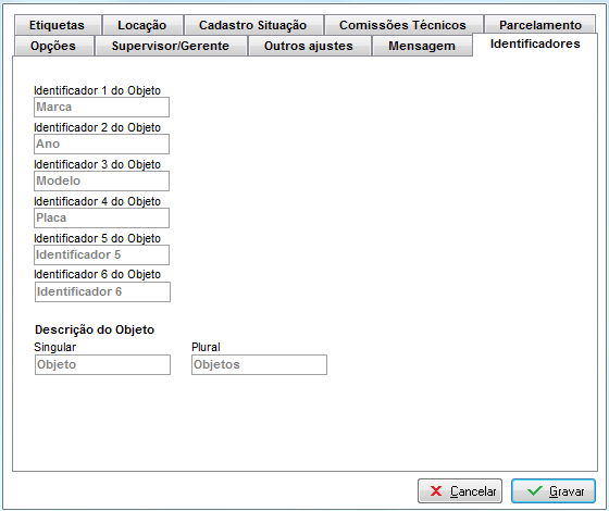 Através da aba Identificadores são configurados os campos que auxiliam na descrição e identificação do objeto, dessa forma o sistema se adapta a empresa que vai utilizá-lo.