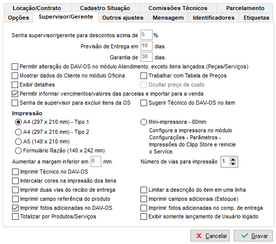 Através da aba Supervisor/Gerente é possível realizar a configuração referente a descontos e datas padrão para previsão de entrega e de garantia.