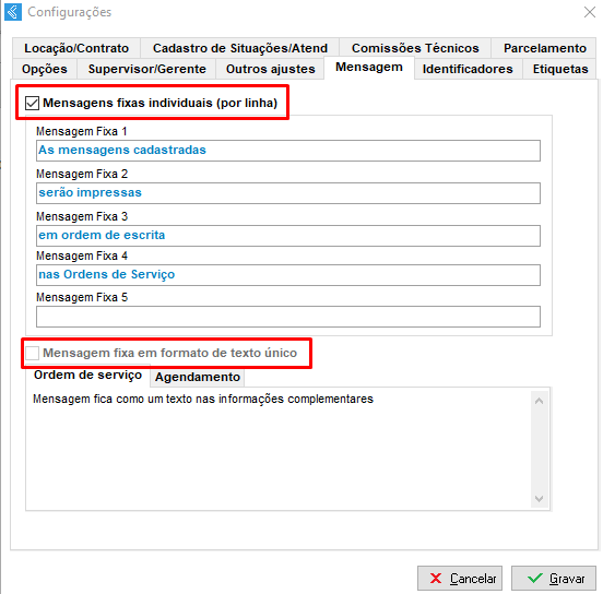 Na aba Mensagem é possível cadastrar algumas mensagens que serão impressas nas Ordens de Serviço emitidas.