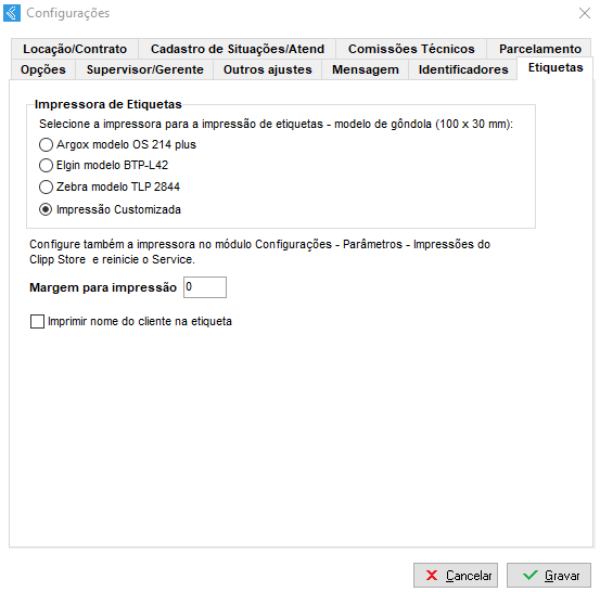 Na aba Etiquetas é possível configurar a impressão de etiquetas realizada pelo Clipp Service, portanto, deve ser selecionado o modelo da sua impressora e em seguida deve-se efetuar a configuração no Clipp conforme solicitado na própria janela de configurações.