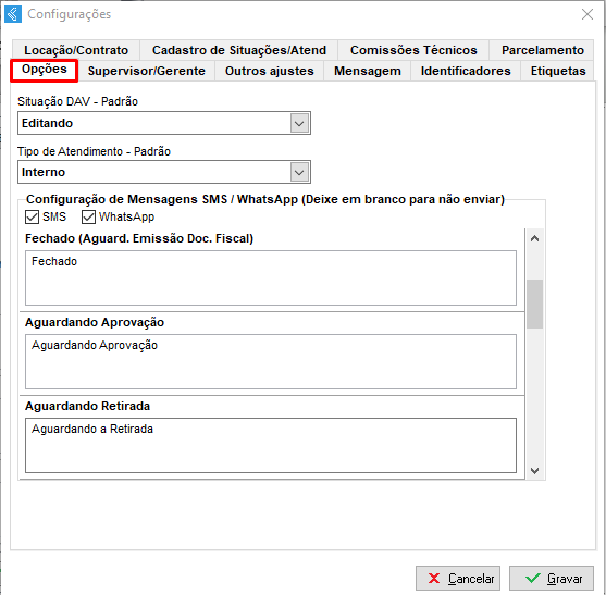 Através dessa aba é possível escolher qual a Situação e o Tipo de Atendimento que serão definidos automaticamente como padrão ao lançar uma nova OS. Além disso, pode ser configurado mensagens padrão para enviar por SMS ou por WhatsApp ao alterar a situação do documento.