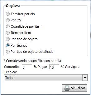 Preencha o % de comissão por Peças e % por Serviços prestados, selecione o técnico que deseja exibir no relatório e clique em Visualizar.