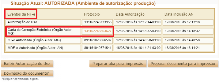 Serão exibidas as informações desta nota e ao final será exibido os Eventos da NFe. Neste local, será possível identificar o evento da Carta de Correção, acompanhada de seu protocolo.