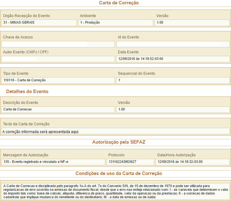 Ao clicar no número do Protocolo da Carta de Correção será exibida outra janela com as informações da CC-e conforme exemplo abaixo: