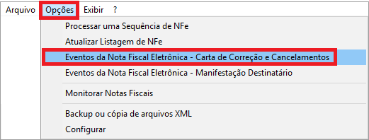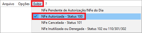 Para lançar a Carta de Correção, acesse o Gerenciador de Notas Fiscais Eletrônicas. Clique no menu Exibir / NFe Autorizada – Status 100;