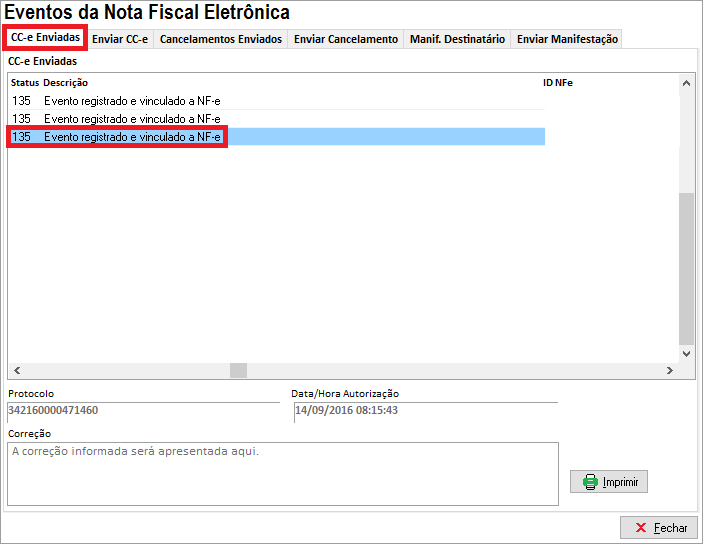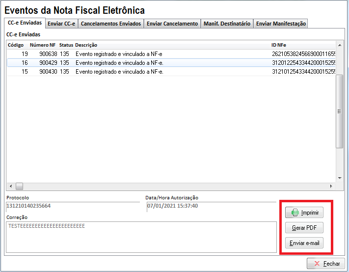 Para imprimir a Carta de Correção, vá na guia CC-e Enviadas, selecione a carta de correção que deseja e escolha se deseja Imprimir, gerar PDF ou enviar e-mail (A impressão será enviada para a impressora definida como padrão do Windows).