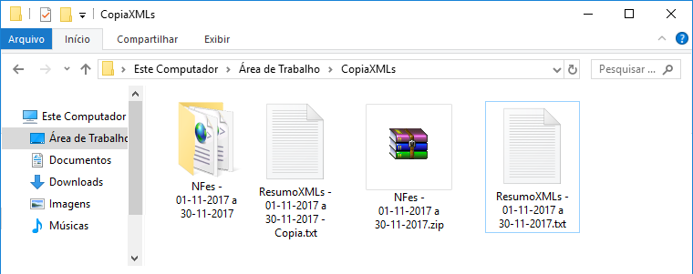 - Se for marcada a opção Gerar arquivo compactado (.zip), será criada uma pasta compactada com o nome de acordo com os parâmetros escolhidos, do contrário, será criada uma pasta normal com a mesma nomenclatura. Adicionalmente é salvo também o arquivo Resumo XMLs em formato texto listando todas as notas copiadas.