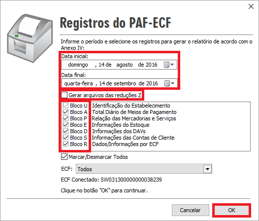 Na tela apresentada a seguir, defina o período e verifique junto ao seu contador os Blocos a serem marcados para correta geração do arquivo. A opção Gerar arquivos das reduções Z deverá ser marcada caso necessite gerar um arquivo separado por dia do período informado. É válido lembrar que apenas os dias em que teve movimentação, serão apresentados no arquivo: