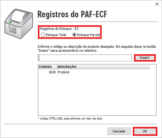 Clique em OK para continuar e selecione se o estoque deve ser Total ou Parcial. Caso optar por Estoque Parcial, informe o código do produto e clique em Inserir: