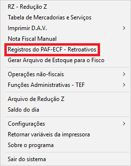Para gerar o Movimento por ECF, primeiramente abra seu Emissor de Cupom Fiscal e acesse o menu F10 Supervisão > Registros do PAF-ECF - Retroativos:
