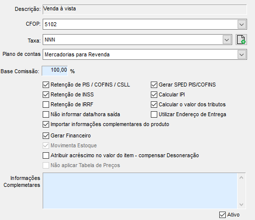 • Taxa - Informe a alíquota da natureza de operação, ou seja, a tributação que pretende destacar (verifique com a contabilidade);