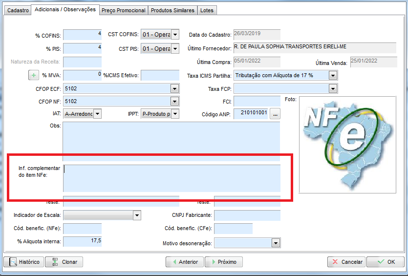 • Importar informações tributáveis do Produto - Vai importar as Informações Complementares do item na NFe, do campo abaixo:
