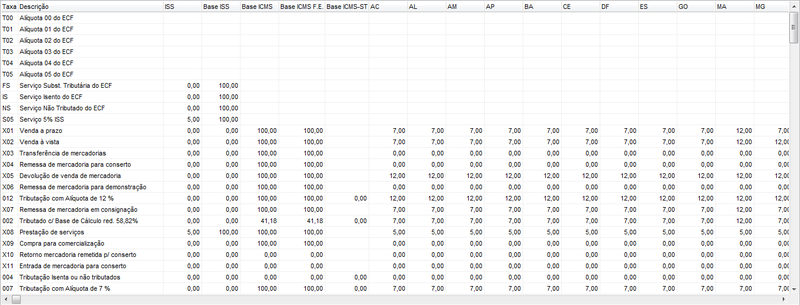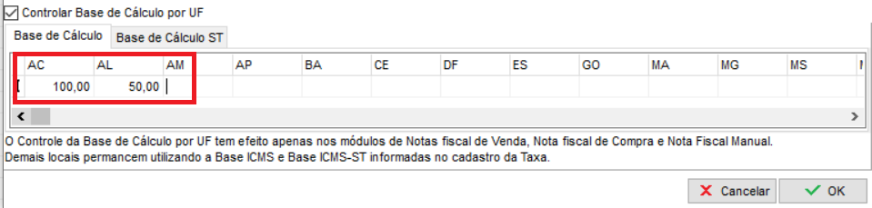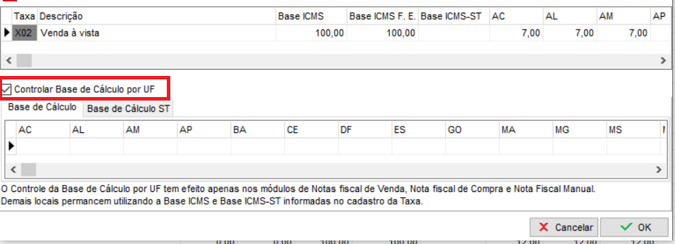 É possível adicionar diferentes base de cálculos por UF, para casos onde possivelmente haja redução de base de cálculo. Para trabalhar dessa forma, clique duas vezes na taxa e marque a opção Controlar base de cálculo por UF;