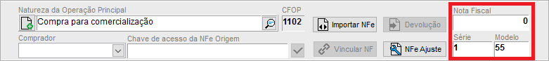 3. Efetue o lançamento da nota fiscal com o número 0 (zero), preencha o campo série com a mesma série usada para emissão de NFe de venda e o modelo 55. Desta forma, a nota de compra será gerada com o próximo número de suas Notas Fiscais Eletrônicas.