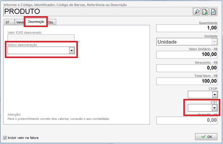 O campo Valor ICMS desonerado será preenchido automaticamente após realizado o preenchimento do campo do Motivo desoneração e for concluído o lançamento do produto na nota através do botão OK.