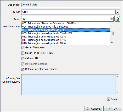 Após configurar o produto, clique em Configurações - Operações ICMS/ISS - Naturezas, clique duas vezes sobre a natureza que deseja utilizar na nota e defina uma taxa que TRIBUTE, por exemplo: