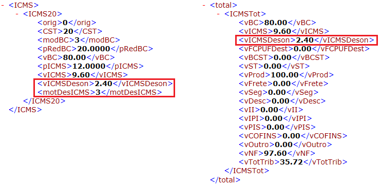 Tendo informado o motivo da desoneração no(s) produto(s), ao emitir a NFe poderá identificar no arquivo XML o preenchimento das tags vICMSDeson (Valor ICMS desonerado) e motDesICMS (Motivo desoneração), além da tag vICMSDeson na parte referente aos totais da nota.