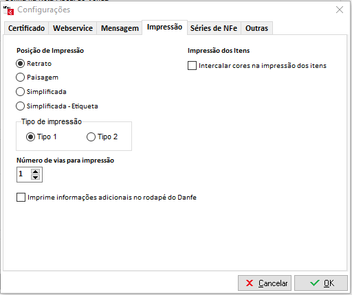 Na guia Impressão será possível definir se o DANFE deve ser impresso em modo retrato ou paisagem, se deseja intercalar as cores na impressão dos itens e o número de vias do DANFE que deseja imprimir.