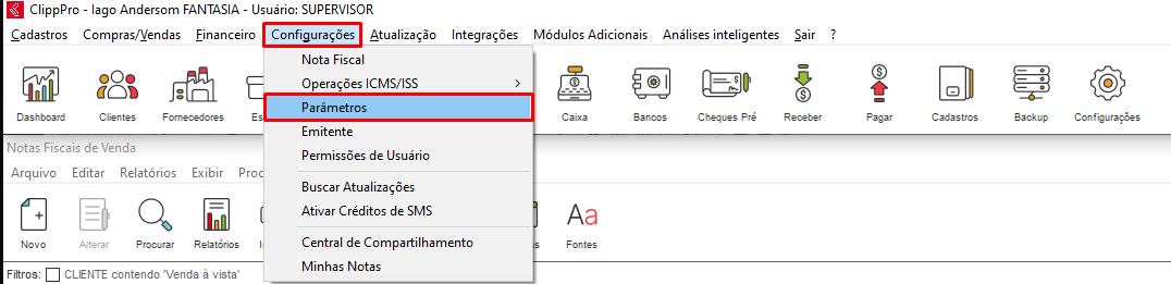 Após o credenciamento junto a SEFAZ, e com o certificado digital instalado, abra seu Clipp Pro, acesse o menu Configurações e clique em Parâmetros.
