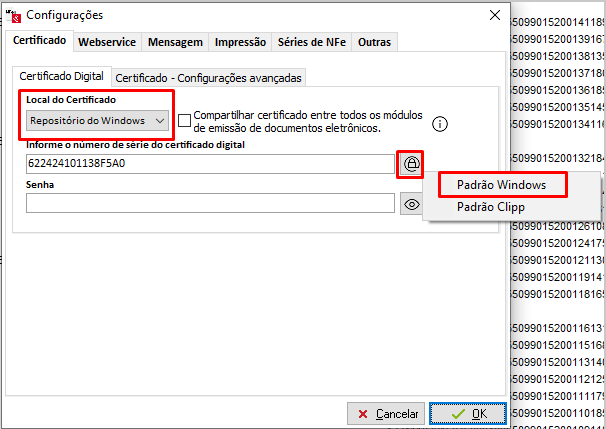 Feito isso, na direita clique em selecione a opção Padrão Windows para assim selecionar o certificado digital que a empresa utilizará para a emissão de Notas Fiscais Eletrônicas (é necessário que o certificado digital já esteja instalado no computador, lembrando que os modelos compatíveis são: A1 e A3).
