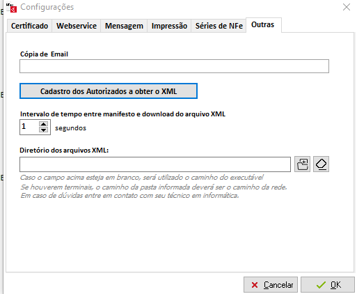 Na janela de configurações, serão apresentadas as abas: Certificado, Webservice, Mensagem, Impressão, Séries de NFe e Outras.
