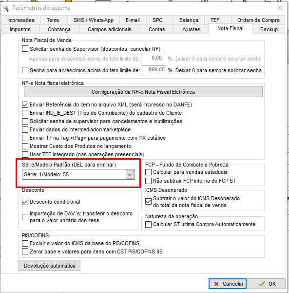 Ao acessar os Parâmetros do sistema. Localize a aba Nota Fiscal e selecione a Série/Modelo cadastrado recentemente como padrão.