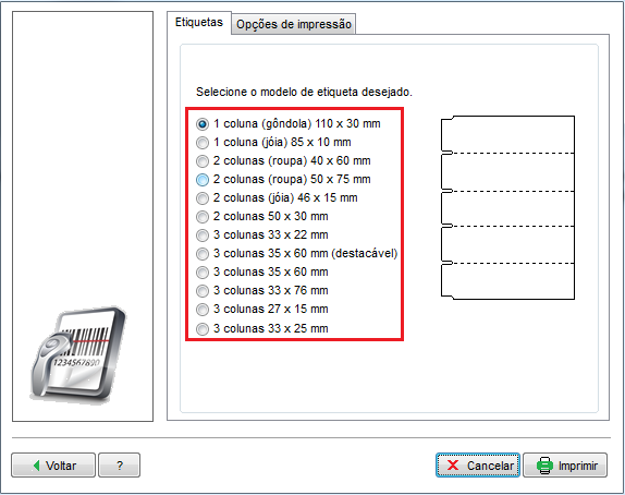 A partir do modelo de impressora selecionada as opções de etiquetas e formas de impressão podem variar: