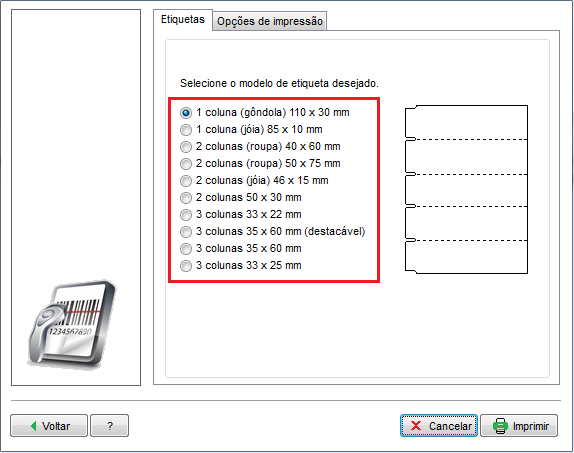 A partir do modelo de impressora selecionada as opções de etiquetas e formas de impressão podem variar: