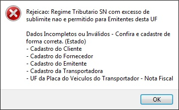 Rejeição 812: Regime Tributário SN, com excesso de sublimite não é permitido para Emitentes desta UF