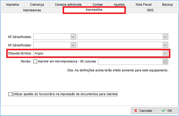 Com a impressora compartilhada, acesse o ClippStore e vá até as Configurações / Parâmetros / clique na guia Impressoras para verificar se a impressora Argox está na lista. Após confirmar essa informação, clique na guia Impressões e selecione em "Etiqueta Térmica" a impressora Argox.