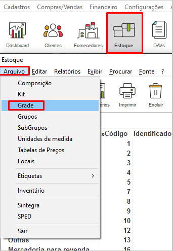 Será necessário efetuar o cadastro das características que compõem a grade. Para efetuar o cadastro destas, basta abrir o Clipp e acessar o módulo de Estoque. Posteriormente vá até o menu Arquivo e clique na opção Grade.