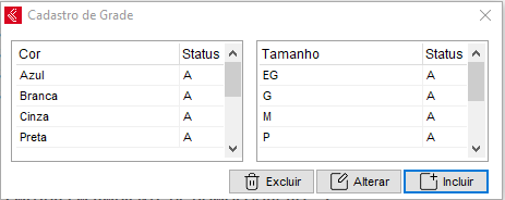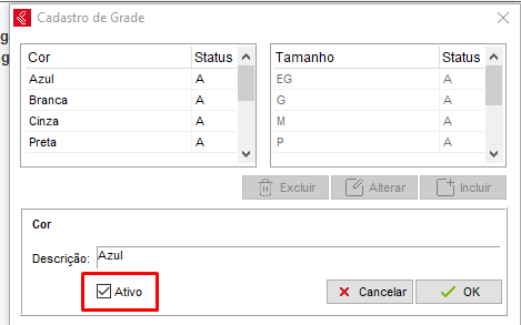 Preencha os dados, cor, tamanho e quantidade (obrigatoriamente deve inserir o Tamanho e a Cor, já a Quantidade poderá informar zero para posteriormente efetuar o lançamento através da nota de entrada) e clique no botão Confirma. É possível inativar o item da grade em questão, basta desmarcar o botão Ativo;