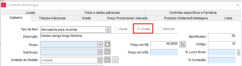 Neste momento será habilitada uma nova aba no cadastro do produto chamada Grade.