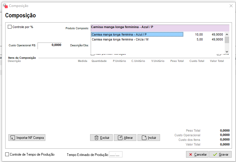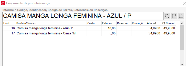 Feito isso, clique no botão Incluir e digite o Código do Produto / Nome / Referência / Código de barras, assim serão relacionados os itens em questão com suas respectivas características.