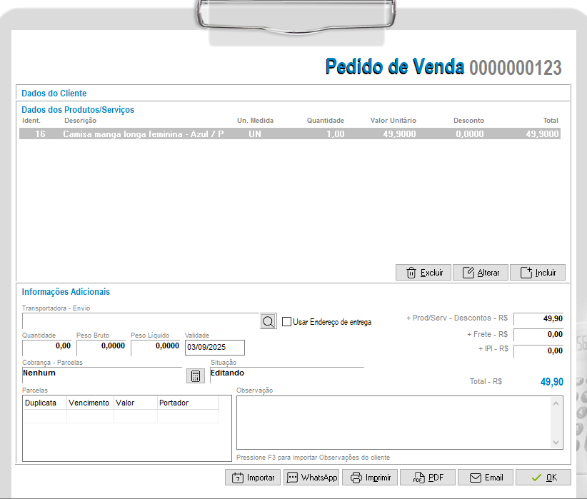 Selecione então todos os itens que deseja, informe seus respectivos dados e clique em OK para que os mesmos sejam incluídos na nota fiscal. Confira as demais informações e finalize a nota.