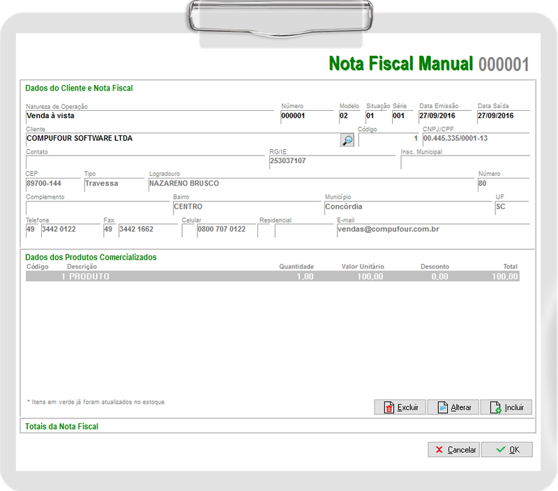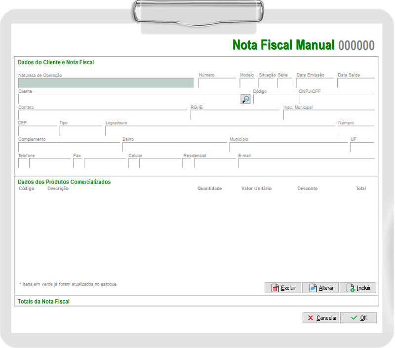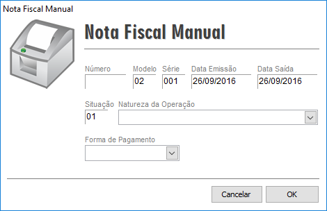 Na nota fiscal manual deverá lançar o Número, Modelo, Data Emissão, Data Saída, Situação e Série da nota em questão (o modelo baseado nos manuais atuais é usado 02, porém, em caso de dúvidas consulte o contador da empresa).