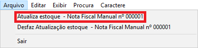 Efetuando os procedimentos acima, a nota será criada, porém, os itens no estoque ainda estão com suas quantidades. Para que o estoque fique correto, é necessário atualizar os dados referentes a nota. Para isto selecione a nota, acesse o menu Arquivo / Atualiza estoque – Nota Fiscal Manual nº 000001.