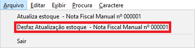 Para excluir uma nota manual é necessário que a mesma não tenha sido atualizada em estoque ainda ou caso já tenha sido atualizada poderá selecionar a mesma acessar o menu Arquivo / Desfaz Atualização estoque – Nota Fiscal Manual nº000001.