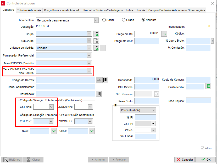 Para Notas Fiscais do Consumidor Eletrônicas, quando for apresentada essa mensagem, abra seu Clipp Store, acesse o módulo de Estoque e abra o cadastro do produto que foi lançado na venda. Neste momento, verifique se o campo CST CFe (para verificar a relação de CST aceitos pela NFC-e clique aqui) encontra-se preenchido conforme a orientação do seu contabilista, também confira se o campo Taxa ICMS/ISS CFe/NFe Não Contrib. encontra-se preenchido ou em branco.