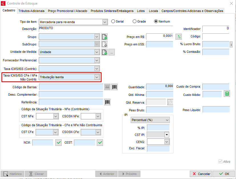 Caso o campo Taxa ICMS/ISS do cadastro do produto estiver preenchido, efetue os procedimentos a seguir: