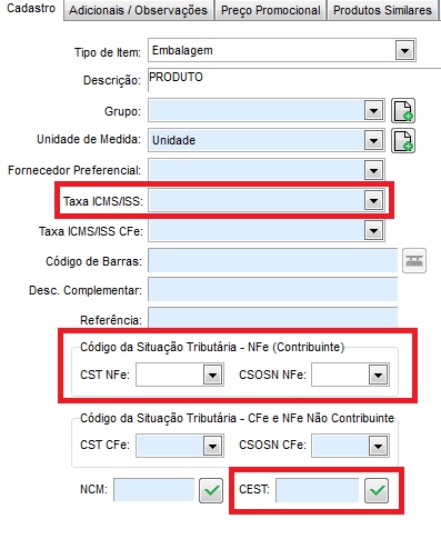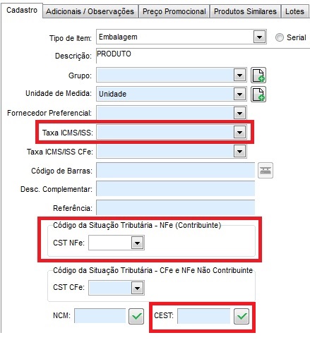 Caso o campo Taxa ICMS/ISS do cadastro do produto estiver preenchido, efetue os procedimentos a seguir: