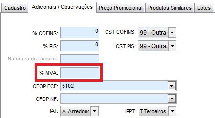 Após ajustar todos os produtos que possuem Substituição Tributária na nota, finalize a mesma e acesse o módulo de Estoque. Neste momento, localize os produtos que foram alterados na sua nota de compra e abra o cadastro dos mesmos. Acesse a aba Adicionais / Observações dentro do cadastro e preencha a % MVA com 0 (zero), clique no OK para gravar o cadastro e faça o mesmo para os demais produtos que serão devolvidos e que foram ajustados anteriormente.