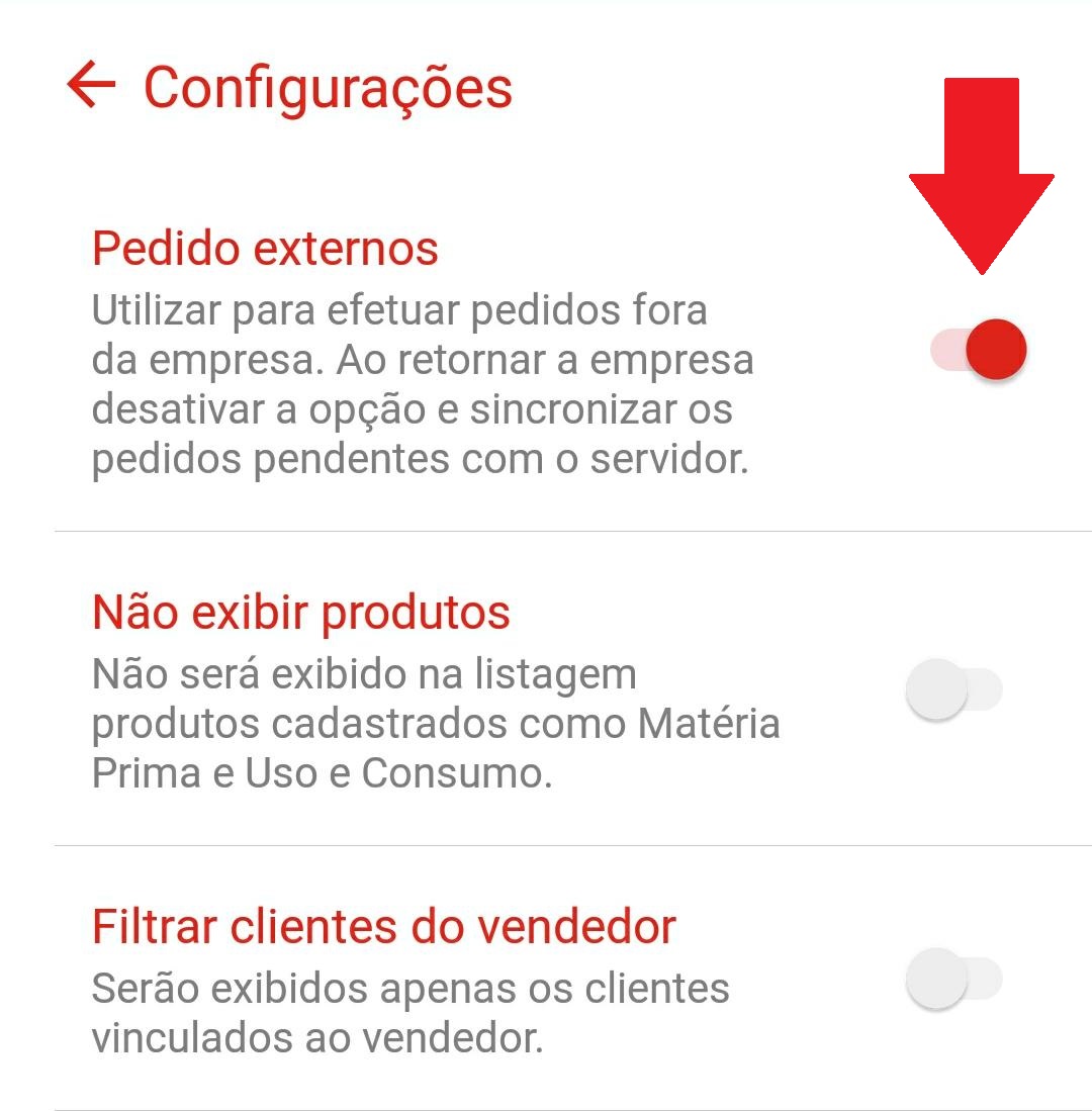 Para realizar a configuração para pedidos externos, na tela inicial do aplicativo toque sobre o botão e habilite a opção Pedidos Externos.